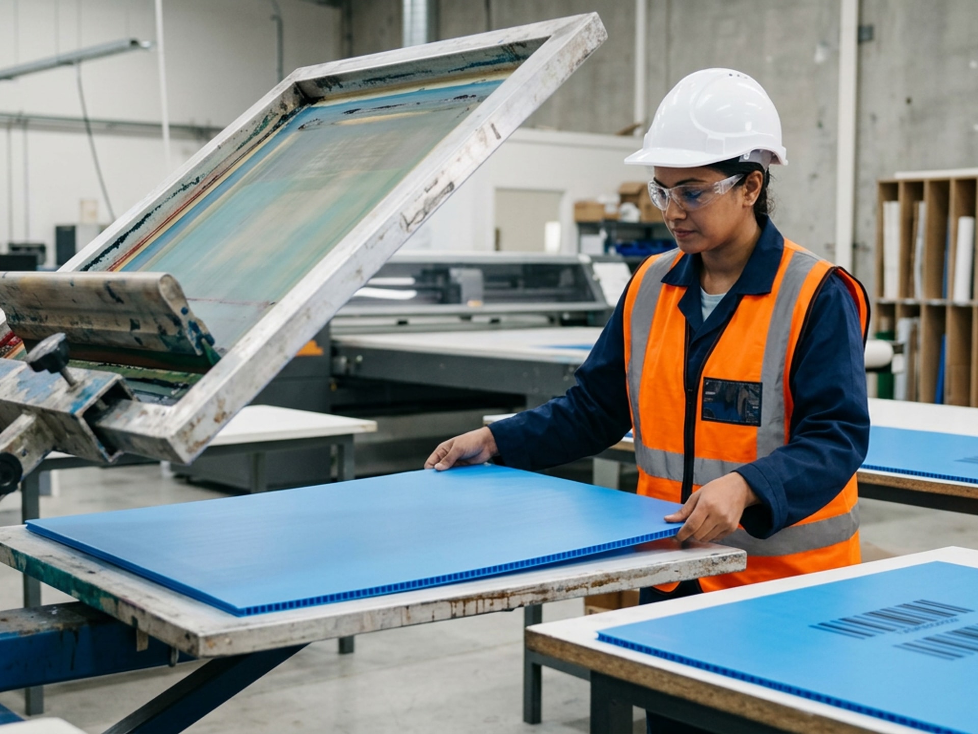 Wide ViewFlat-bed screen printing on PP corrugated panels — part numbers, barcodes, colour coding and logos