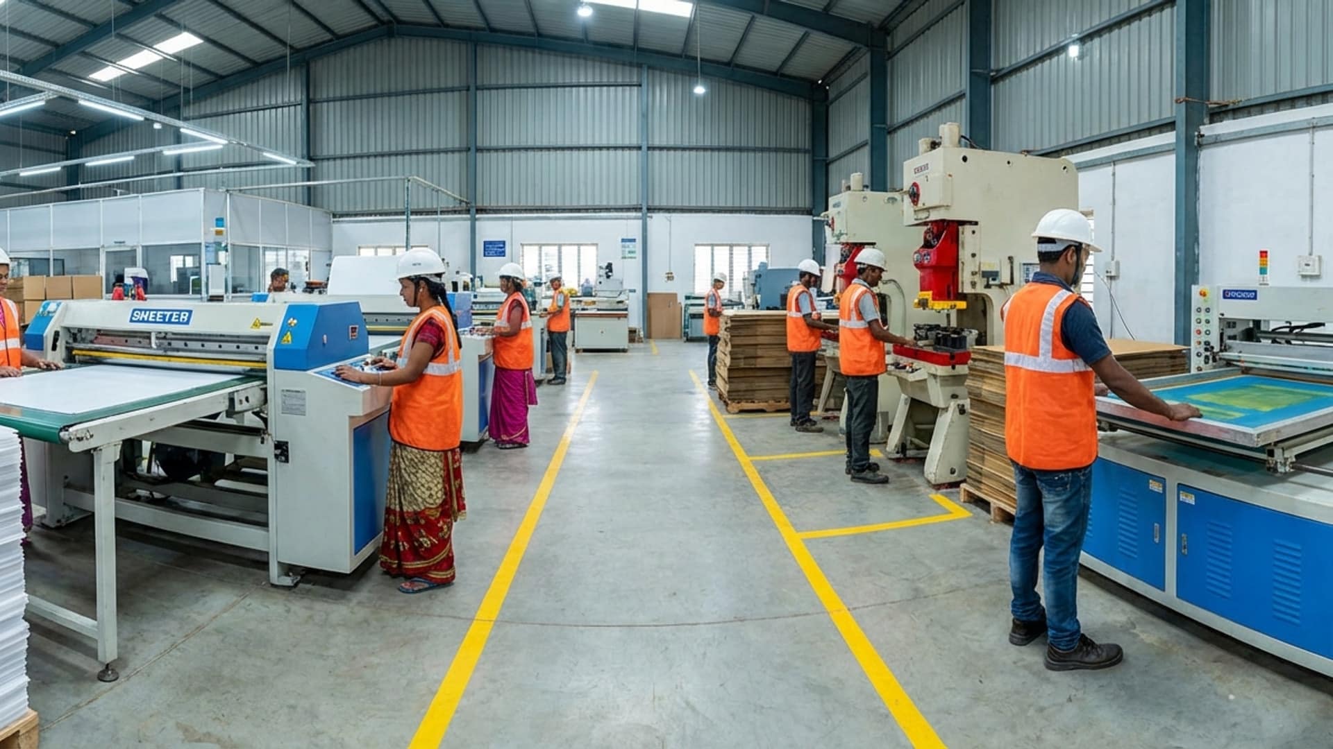Two manufacturing verticals — PP corrugated packaging and paper/board conversion — serving automotive, pharma, FMCG and export industries across 21 states.