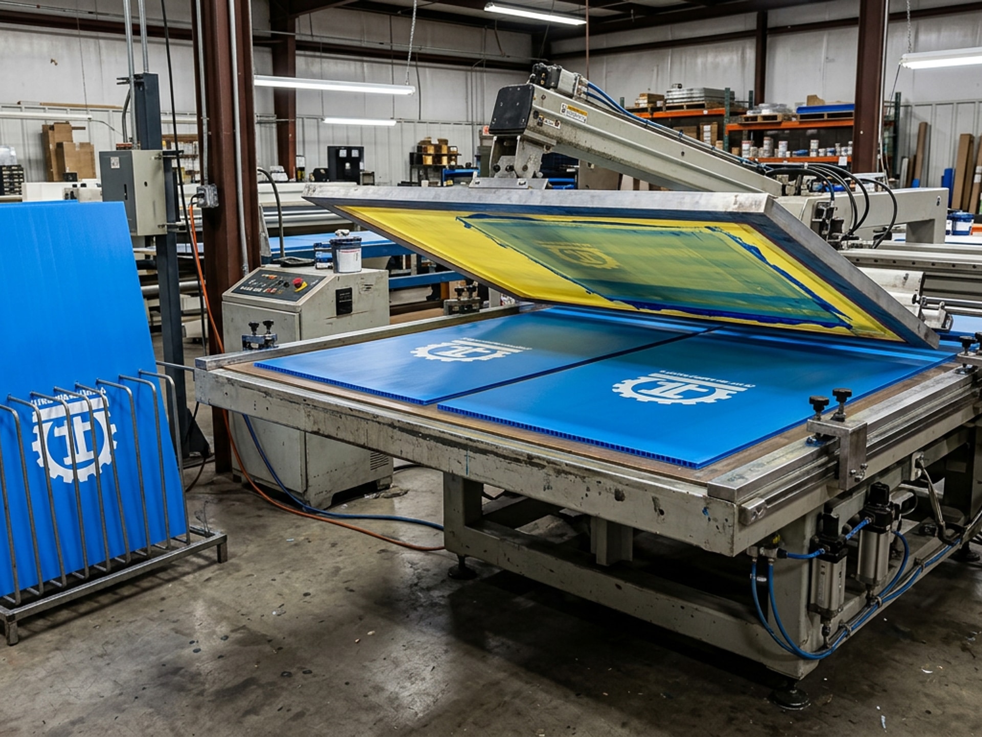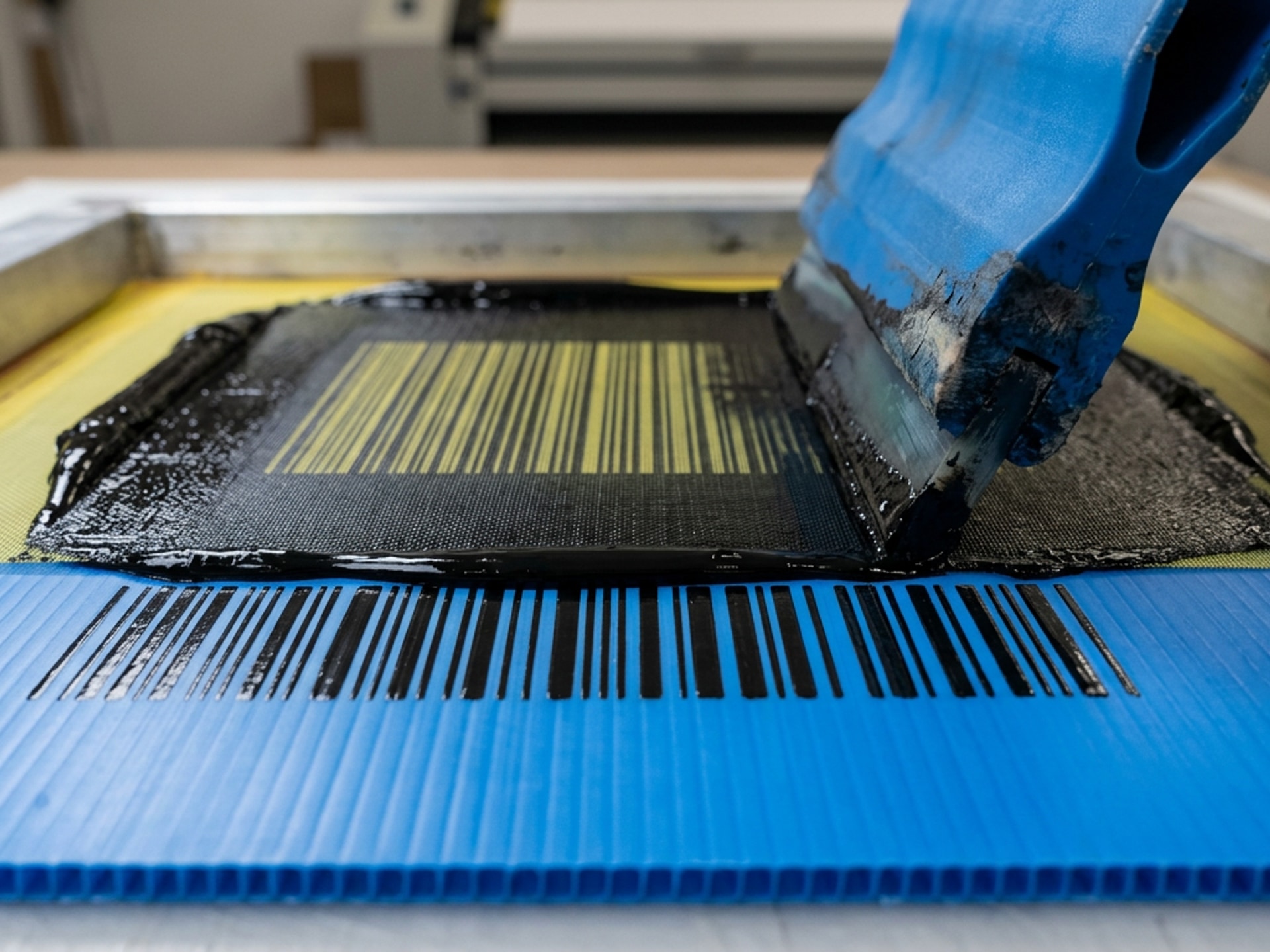 Wide ViewFlat-bed screen printing on PP corrugated panels — part numbers, barcodes, colour coding and logos